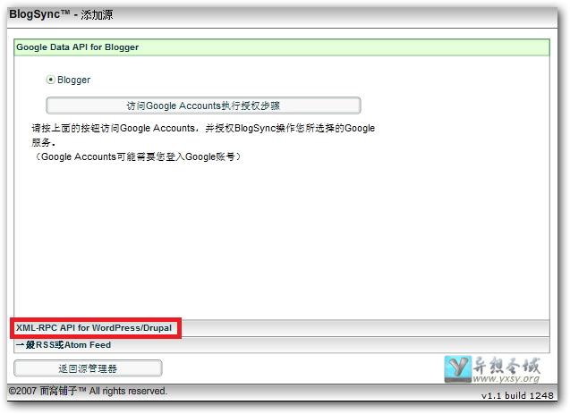 xmlrpc接口:Emlog:http://blog.yxsy.org/xmlrpc.php Wordpress:http://yxsy.org/blog/xmlrpc.php(记得将地址改成你的博客!)