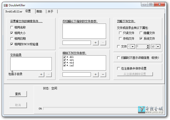 你的硬盘上有重复的文件么?我指的不是备份出来的文件,而是同一个文件的没有用的复本,可能是你不知不觉中下载或多次创建的。DoubleKiller能帮你把他们找出来。尽管这个程序使用起来有些别扭(例如在你使用第一个标签功能之前必须先设置第二个标签),但是这个程序可以搜索不同驱动器的指定类型文件,查找文件名、大小、创建时间或CRC32校验相同的文件。完成搜索后,DoubleKiller可以让你批量选择是移动还是删除它发现的相同的文件。