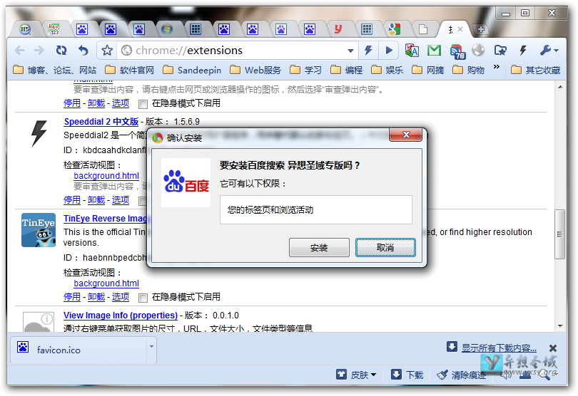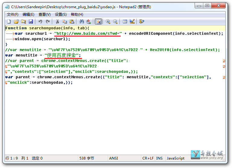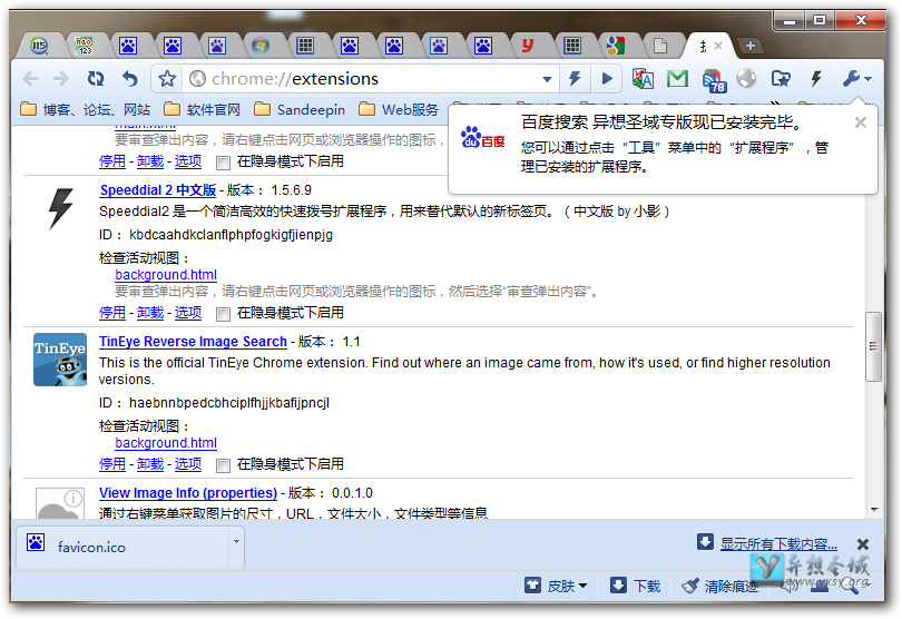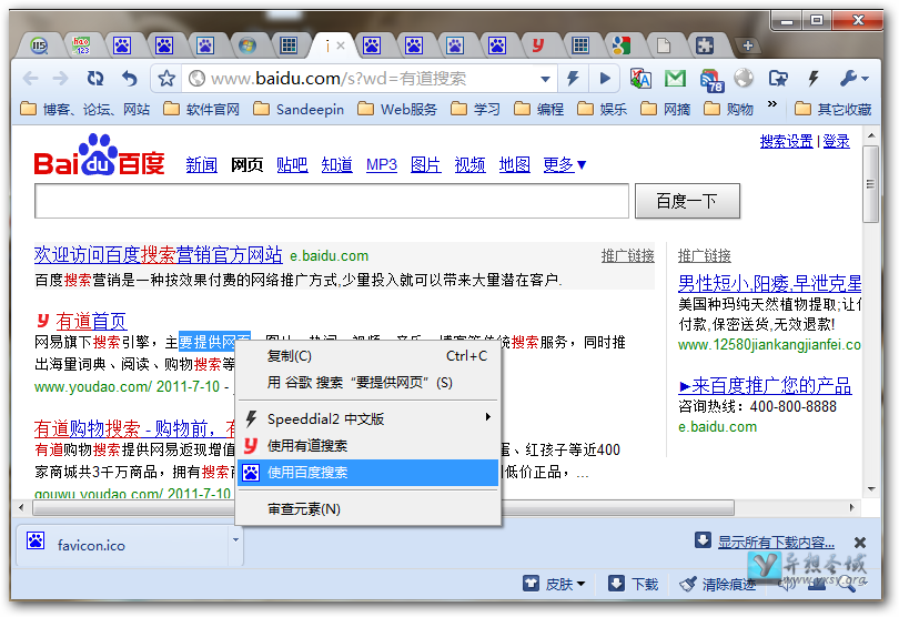 此想法源于使用Chrome时,选中文本后右键菜单会增加一条“使用Google搜索”菜单,此功能非常方便,不过chrome默认支持添加一个搜索引擎,要么google,要么百度,或者其它,相比搜索效果,肯定google最好了,不信大家搜索图片“科学”,就知道孰优孰劣。所以Sandeepin默认使用的是google,不过大家也知道,“胡萝卜温度计是不能随便学习的”,再说有时找一些中国特色软件,还是百度给力,所以能同时使用两个搜索引擎就最好了。我在网上搜索很多相关插件,均不让我满意。不过在这里看到一有道搜索插件倒还不错,若能改为百度搜索就更棒了。