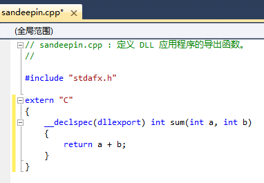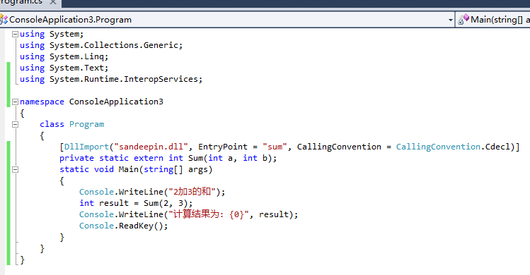 [DllImport("sandeepin.dll", EntryPoint = "sum", CallingConvention = CallingConvention.Cdecl)]