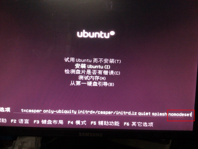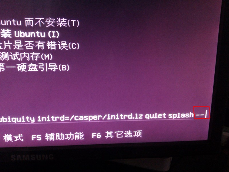 在选择安装Ubuntu后先不要按回车,先按F6在按下ESC,然后光标移到splash后面,删除那个–