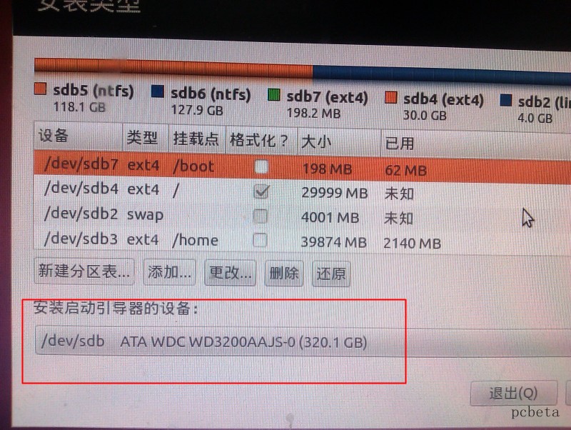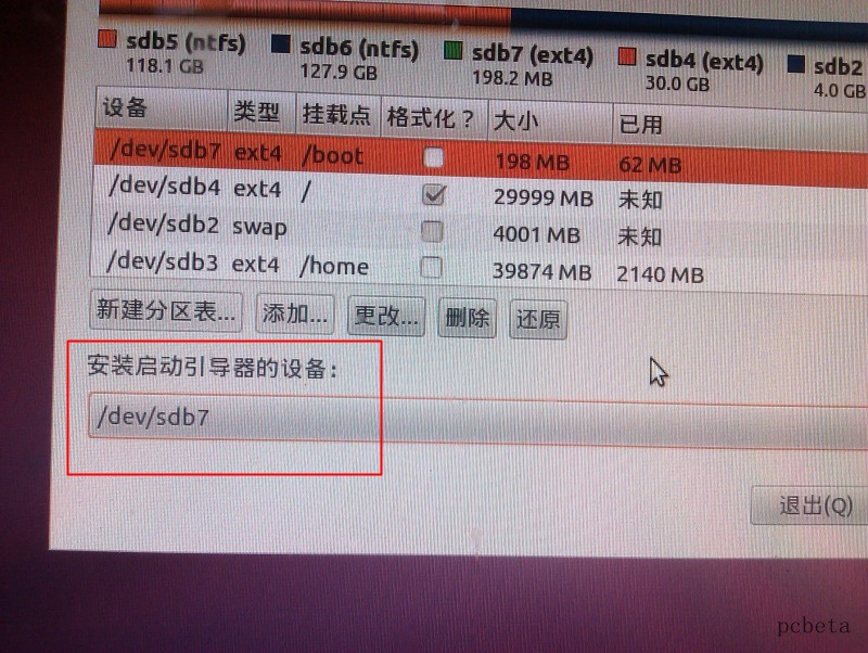 首先在上边看你创建的”/boot“分区的编号是什么,比如我的是sda7 (你的可能不是sda7,可能是sda5,sda6等等,取决于你的/boot分区编号),那么在下边的”安装启动引导区的设备“下拉选项框选择”sda7“,如果这步忽略了,你就用了Ubuntu系统来引导Windows了。
