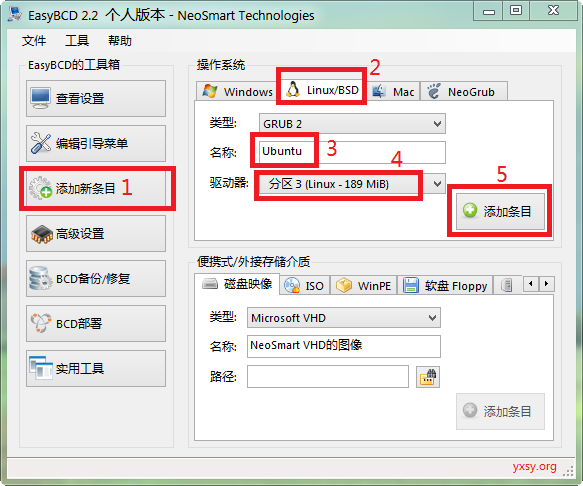 这里注意一点,有的人反应会不能引导,经本人测试是GRUB的问题,症状是选择UBUNTU引导就黑屏,只能看到左上角有个光标在闪,在下面这张图片里的第二到第三步的中间那个类型里选择GRUB 2可以解决: