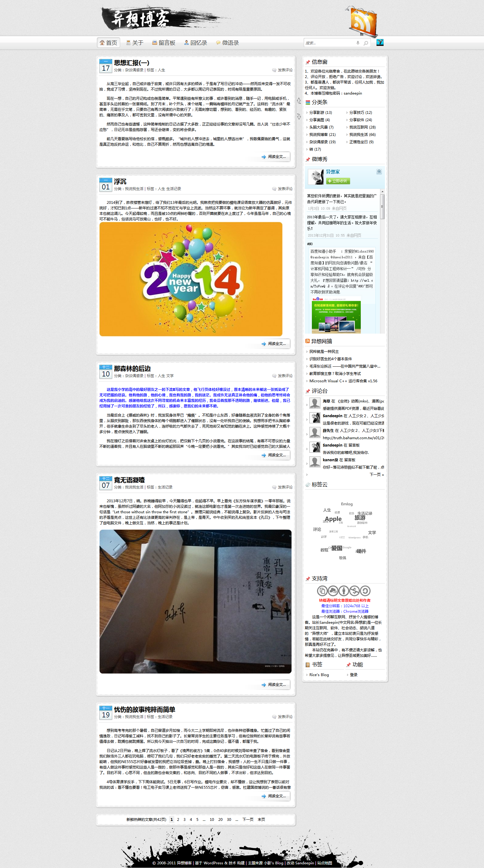 今天就是除夕,张颐武老师引用戴叔伦的诗“旅馆谁相问,寒灯独可亲。一年将尽夜,万里未归人。寥落悲前事,支离笑此身。愁颜与衰鬓,明日又逢春。”感慨诗人在这时刻有飘零的感伤,但我们还是应该快乐。这番话实在在理,人自然有忧伤,但快乐也不会少。这不,Sandeepin几天前就为了马年的新面貌折腾着博客主题——新年,该有新面貌了。