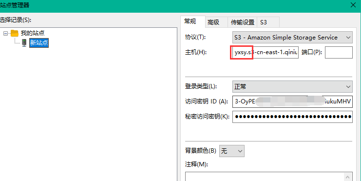 按下图填写,主机填七牛网站上列的空间域名,如:yxsy.s3-cn-east-1.qiniucs.com,密钥填AccessKey/SecretKey,在七牛的官网上可查看。