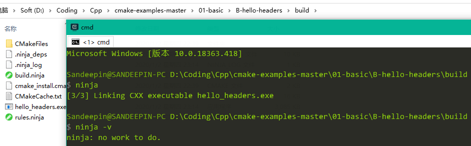 比如01-basic\B-hello-headers项目,运行指令:cmake -Bbuild -GNinja 即可生成ninja工程。