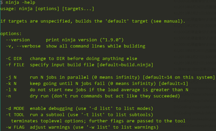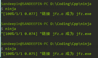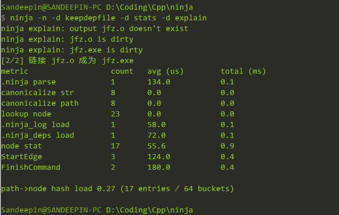 第一次运行按任务先编译,再链接,最终产生了可执行文件,第二次运行由于没改文件,ninja不处理。ninja支持如下参数:
