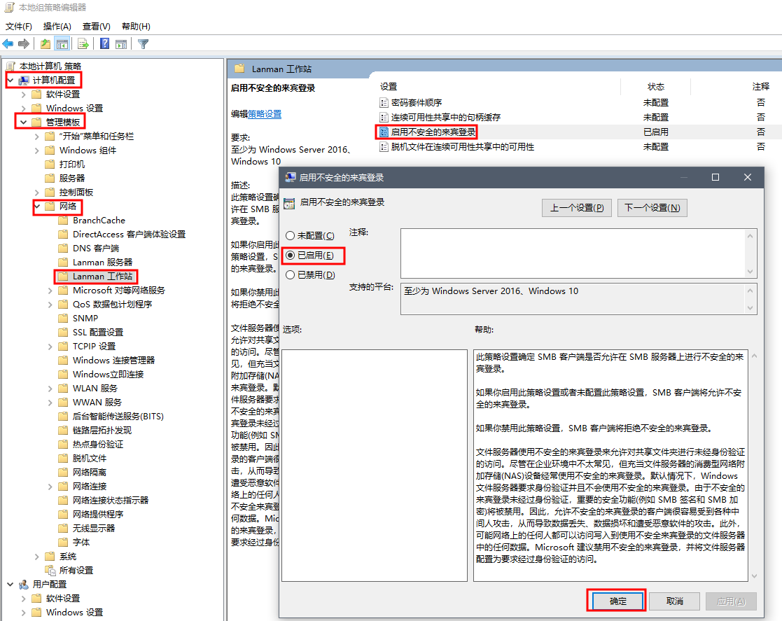计算机配置——管理模板——网络——Lanman工作站——启用不安全的来宾登录——已启用,最后重启电脑。
